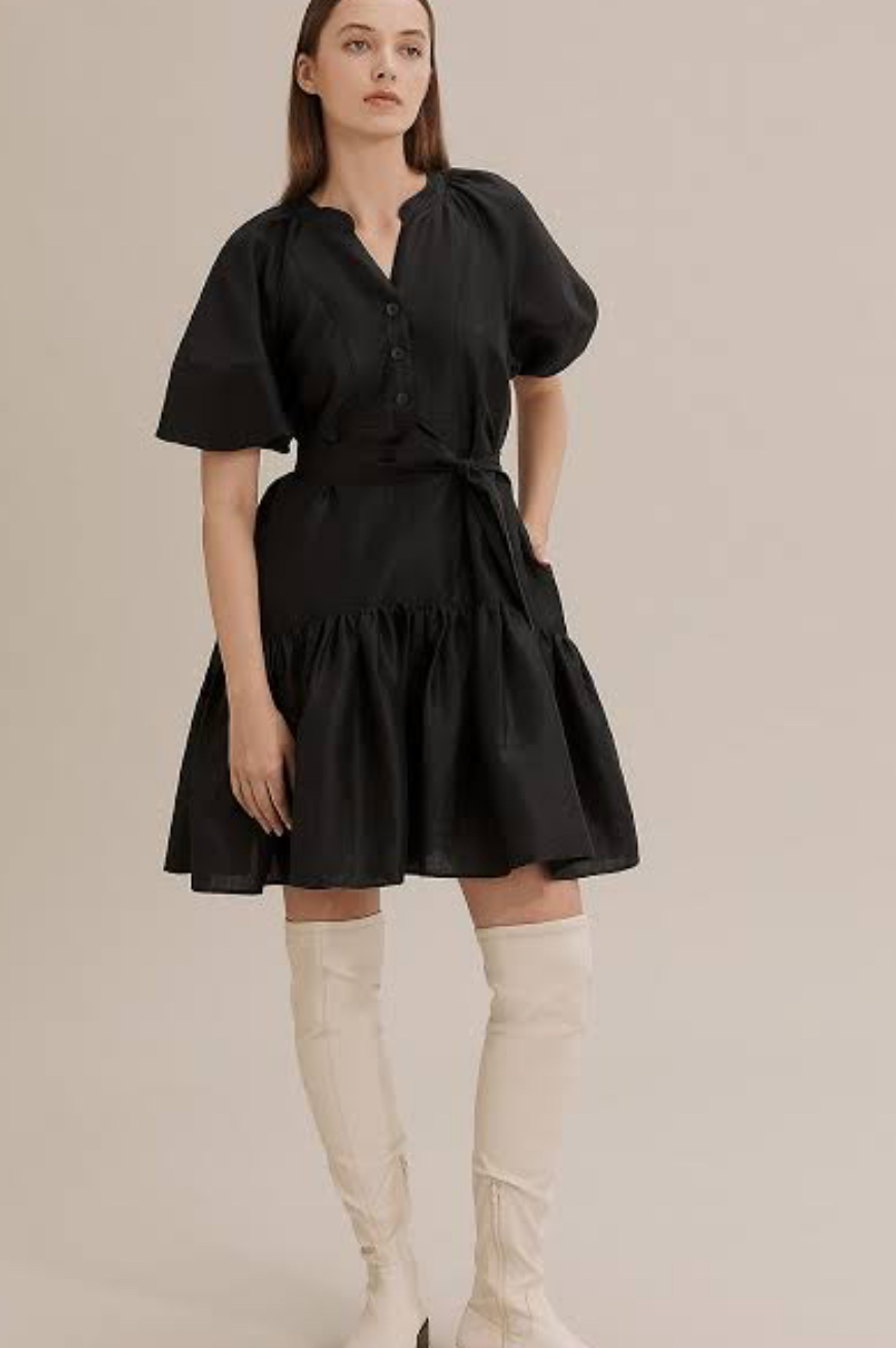 Jena looks stunning in this puff sleeve mini dress! Made from lightweight ramie, it features a button front, raglan sleeves, a removable belt, and delicate frill detailing along the hem. This dress is perfect for those who want to embrace a feminine and playful style